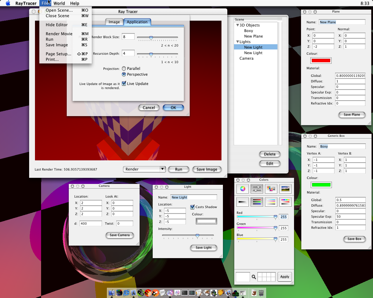 I wrote my ray tracer in Objective-C for Mac OSX. At this time, Mac OSX was fairly immature particularly in terms of its